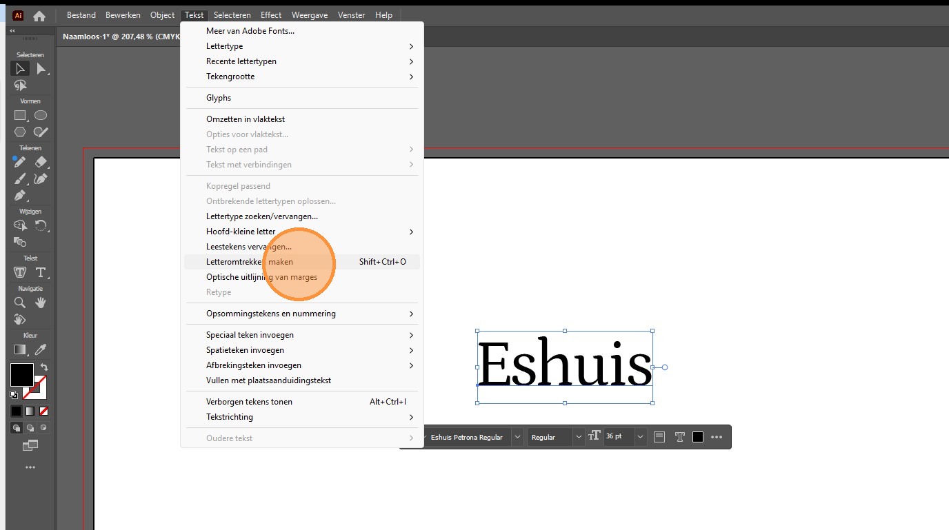 2. Via het kopje tekst vind je de optie letteromtrek maken. Klik op deze optie of gebruik de sneltoets shift+ctrl+O om een letteromtrek van de tekst te maken